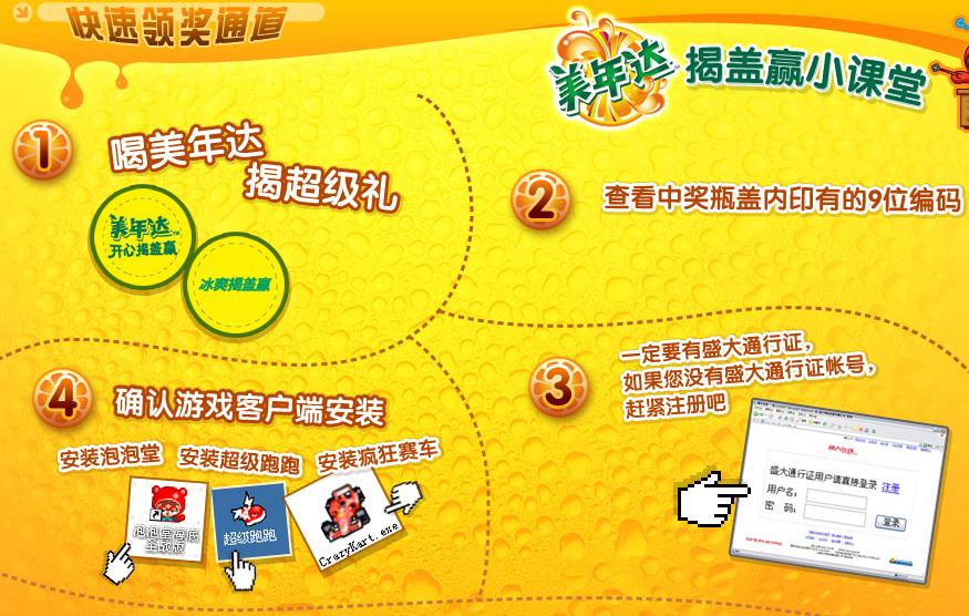 其中玩游戏赢取积分的活动具体为喝美年达,揭超级礼;查看中奖瓶盖内印有的9位编码;一定要由盛大通行证,如果您没有就要先进行注册;确认游戏客户端的安装,安装泡泡堂或者安装超级跑跑、疯狂赛车等;登陆游戏输入通行证账号,建立游戏角色即昵称;在激活页面输入9位激活码绑定您的盛大通行证账号,并选择您喜欢的游戏;然后进入领奖页面领奖;最后一步即到游戏查看奖品等,您就有机会领奖啦!