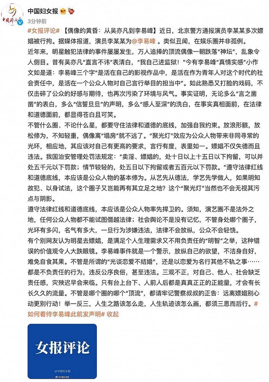 @中国妇女报 微博9月12日就李易峰嫖娼被拘事件发表评论称,遵守法律红线和道德底线,本应该是公众人物率先捍卫的。须知,演艺圈不是法外之地,任何公众人物都不能试图僭越法律;社会舆论不是没有记忆,不管身处哪个圈子,光环有多闪,名气有多大,一旦行为涉嫌违法,法律不会放纵,公众不会轻饶。