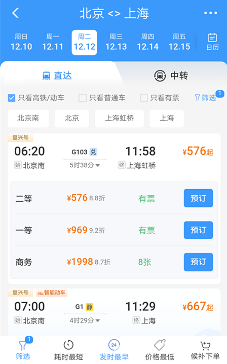 近日,“铁路12306”APP购票页面改版,新版查询高铁和动车车次信息时,可在查询页面直接选购座席等级,同时显示折扣信息。目前多条铁路采取折扣浮动策略,在公布票价的基础上,实际票价有所浮动。
